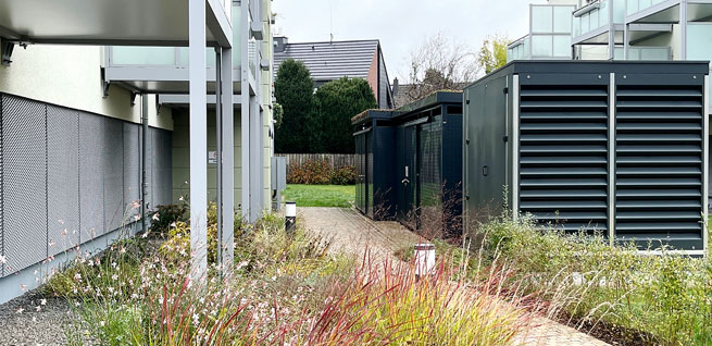 Die drei Gebäude liegen in einem beliebten Wohngebiet in einer Sackgasse, was das Verkehrsaufkommen reduziert und Einbruchsversuche unattraktiver macht. Einrichtungen des Gemeinbedarfs wie Kindergärten, Schulen, Spielplätze, Sporteinrichtungen, Praxen und Einkaufsmöglichkeiten sowie eine Haltestelle des ÖPNV und weitere Infrastruktur befinden sich in der Nähe. In zwei Gebäuden sind ebenerdig Garagen untergebracht, in der Etage darüber beginnen die Wohnungen. Im Haus Blumenesch 10 gibt es zwei ebenerdige Wohnungen. Haus 10 benutzt die Garage des benachbarten Gebäudes mit. Es gibt einen zusätzlichen rückwärtigen und nachts beleuchteten Weg von Haus 10 zur Garage in Haus 6b. Die Ausleuchtung der Wege zu den Hauseingängen und ebenso der Garagen wird über Bewegungsmelder gesteuert. Das Grundstück ist eindeutig und sicher vom Verkehr abgetrennt. Ein Übersichtsplan mit den drei Adressen an prominenter Stelle hilft Besucher*innen und Einsatzkräften sich schnell zu orientieren. Alle Hauseingänge sind transparent gestaltet und barrierefrei. Im Hausflur hängen Schilder mit Ansprechpartner*innen aus. Neben den Aufzügen und an den Zwischentüren zu den Wohnungen sind zur besseren Orientierung die Geschosse nochmals angezeigt. Die Terrassentüren der beiden Erdgeschosswohnungen sind von innen abschließbar. Sämtliche Fenster, Balkon- und Terrassentüren sind mit Außenjalousien ausgestattet, wodurch ein einheitliches Bild und ein höherer Einbruchschutz entstehen. Außer im Fahrradabstellhäuschen draußen, gibt es auch am Haus die Möglichkeit Fahrräder abzustellen. Im Waschmaschinenraum sind für jede einzelne Wohnung abschließbare Steckdosen für Waschmaschinen und Trockner installiert. Die Müllcontainer sind in einer verschließbaren Abstellbox untergebracht. Ein externer Anbieter sortiert den Müll aus den Containern noch einmal nach. Eine Wärmepumpe im Hof sowie Photovoltaik-Pannels auf den Dächern gehören zum Energiekonzept der drei Gebäude. Die WGO bemüht sich generell um ein mit dem städtischen Anbieter abgestimmtes Konzept für eine möglichst günstige und sichere Energieversorgung ihres Bestandes.
